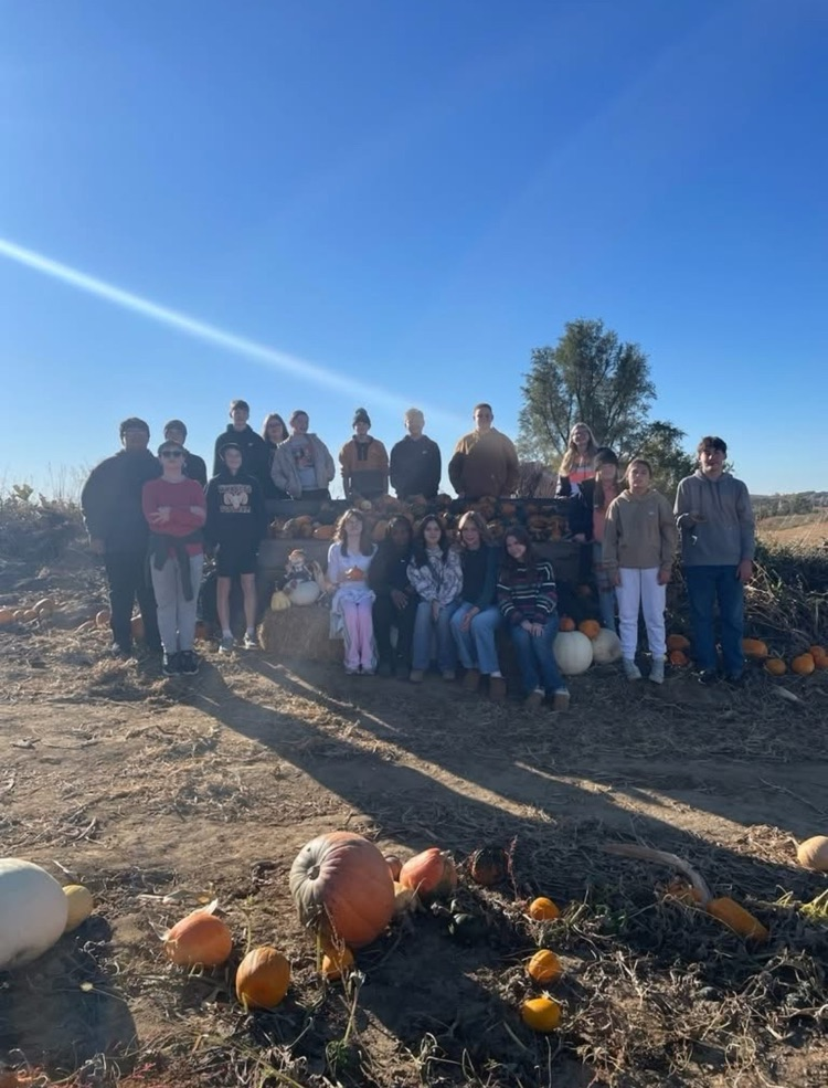8th grade - 4th grade taking a picture break at the Hillside Harvest pumpkin patch.